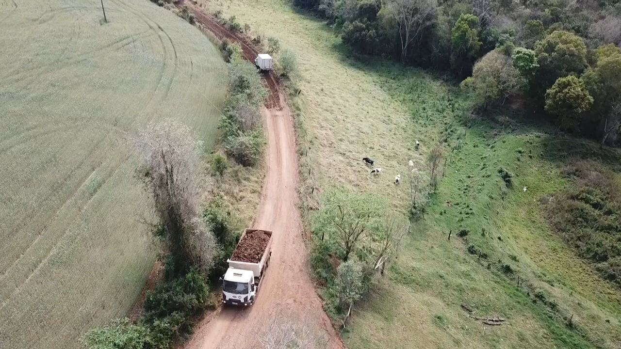Da porteira pra fora há a preocupação com a manutenção das estradas vicinais. Patrolamento, readequações e cascalhamento garantem a ida e vinda de veículos, inclusive do transporte escolar, além do escoamento da produção.