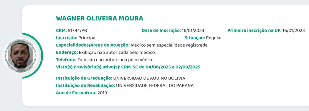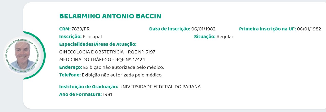 Nem Baccin tampouco Moura tinham as especialidades necessárias para o procedimento. A especialidade registrada de Antonio Baccin no Conselho Regional de Medicina (CRM) é Ginecologia e Obstetrícia, não constando o Registro de Qualificação de Especialidade (RQE) em Anestesiologia. Já Moura, formado em 2019, não possui nenhuma especialidade.