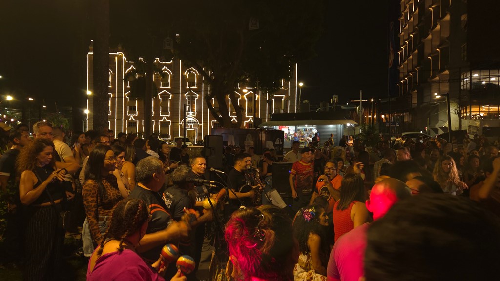 Grupo de Carimbó Sancari. Ao fundo, iluminada, a Companhia Docas do Pará (Foto: Thiago de Oliveira/RSN)