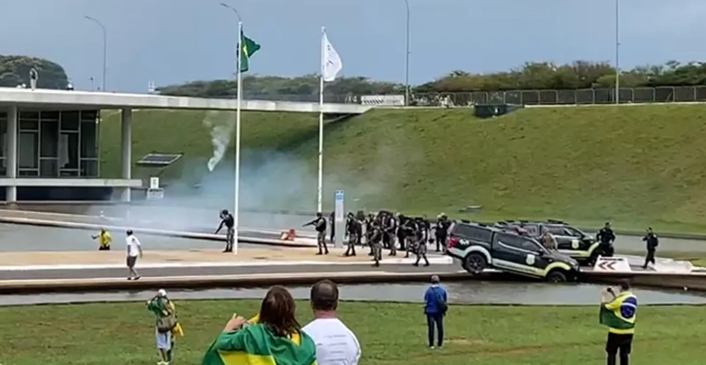 Policiais militares tentaram conter os bolsonaristas com uso de spray de pimenta. No entanto, eles invadiram a área de contenção que cercava o Congresso Nacional. Imagens do local mostram que um veículo da Força Nacional caiu no espelho d’água do Congresso.