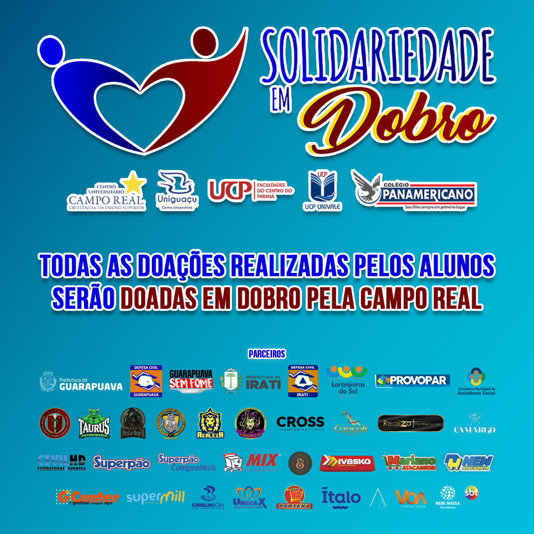 Valorizando a responsabilidade e o compromisso social com a comunidade, o Centro Universitário Campo Real lançou a Campanha Solidariedade em Dobro. Assim, busca arrecadar alimentos, produtos de higiene pessoal e materiais de limpeza. Todas as doações feitas pelos acadêmicos vão ser dobradas pela instituição.