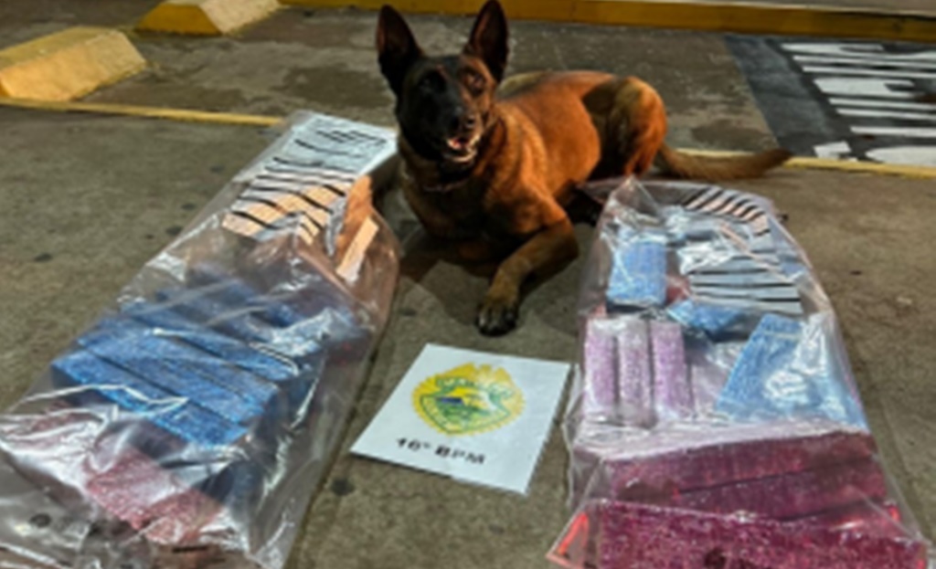 De acordo com a Polícia Militar, o flagrante ocorreu por volta da meia-noite, quando as equipes do Choque e K9 faziam a vistoria de um ônibus que se dirigia de Foz do Iguaçu a São Paulo. Durante a inspeção do bagageiro, o cão Rafiki sinalizou positivamente para a presença de drogas em duas malas.