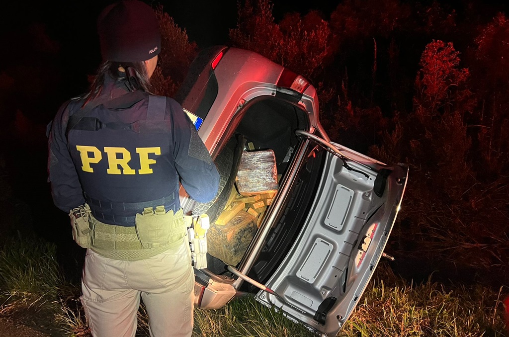 A Polícia Rodoviária Federal (PRF) apreendeu 102 quilos de maconha no porta-malas de um Fiat Siena na madrugada desta quinta (9) em Guarapuava. Mas antes da apreensão, a PRF percorreu cerca de três quilômetros em perseguição ao carro. Em determinado momento, o motorista saiu da pista e tombou.