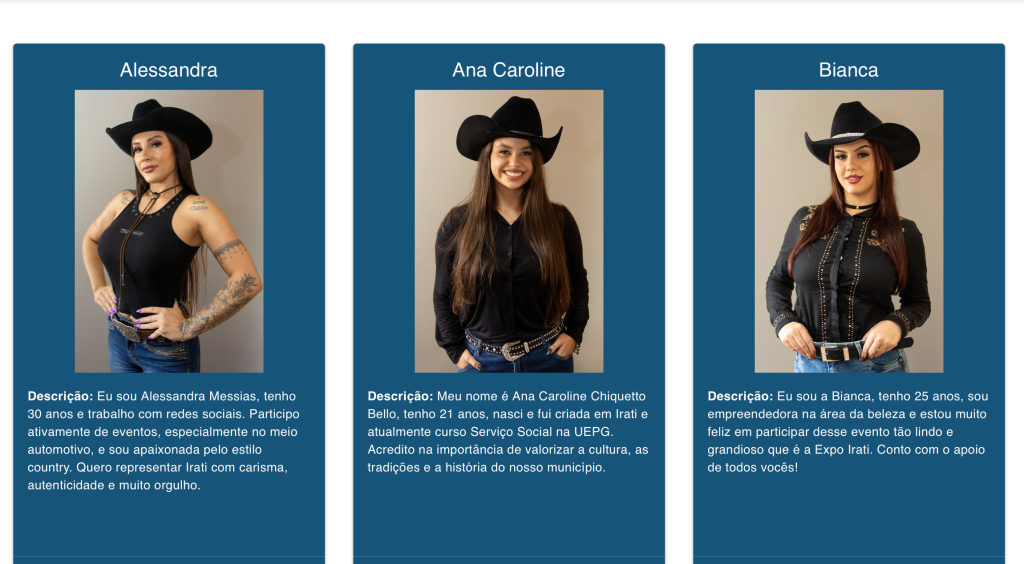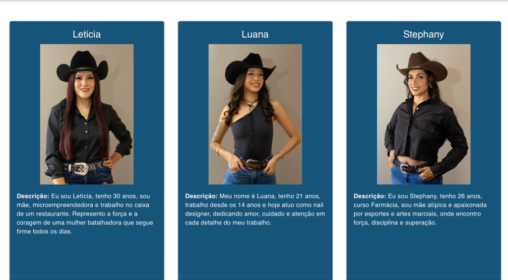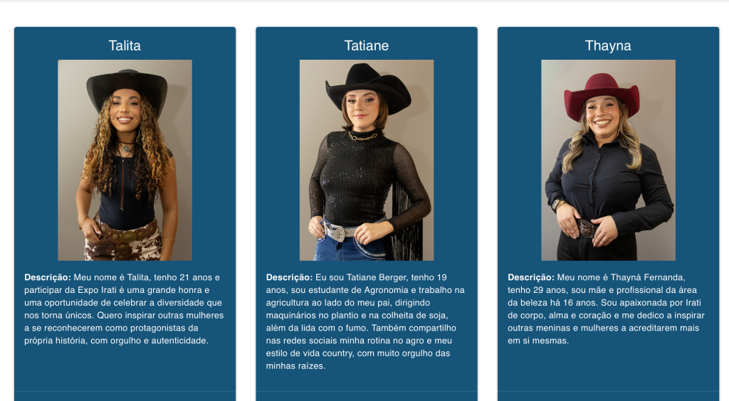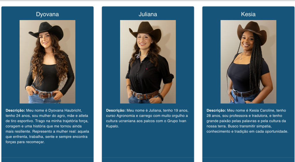 O concurso reúne candidatas com trajetórias diversas, refletindo diferentes setores que estruturam o município. Entre os perfis, há forte presença do agronegócio, com estudantes de Agronomia e mulheres que atuam diretamente na produção rural.