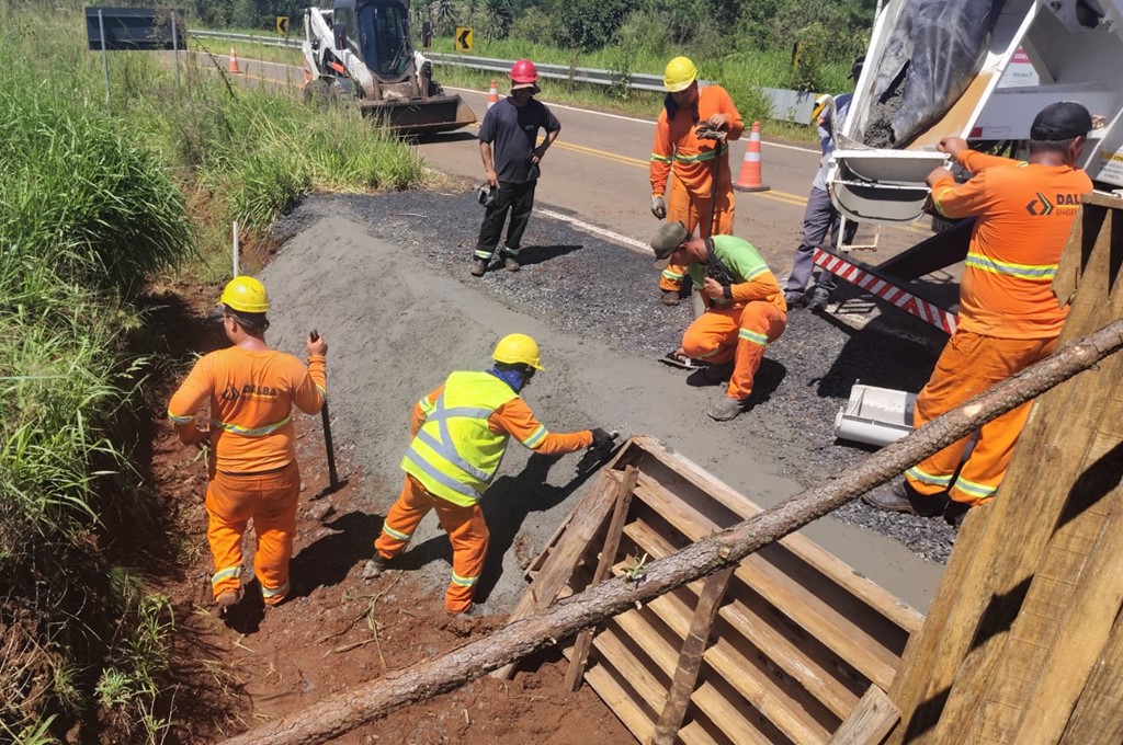 O Departamento de Estradas de Rodagem do Paraná executa melhorias no pavimento de um trevo da PR-560, em Candói. A intervenção ocorre em um entroncamento da rodovia com uma estrada rural, a cerca de um quilômetro do Rio Jordão. No local, as equipes reforçam e alargam o pavimento dos tapers, faixas utilizadas para a transição entre uma via e outra.
