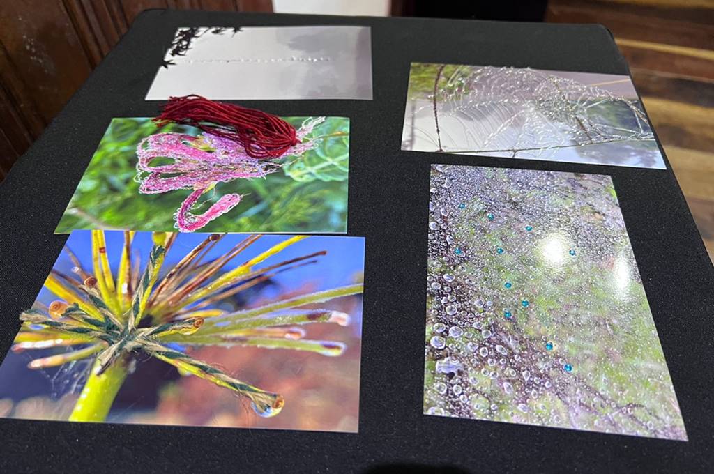 A ideia era que todos pudessem participar da exposição ‘Brevidade da Vida em Gotas’. Mas, como apresentar a fotografia a todos eles? Qual a forma? No primeiro momento com a curadora Claudia Batista apresentamos as palavras em braille. A Apadevi nos presenteou com a escrita das palavras em braille. No segundo momento temos as fotografias com texturas para representar as gotas, as teias, as flores, folhas e a natureza em si. No terceiro momento veio a áudio descrição das fotos, como não temos os aparelhos, a professora Angela organizou as turmas com horários agendados para uma visita, e eu explicava todas as fotografias para os alunos.