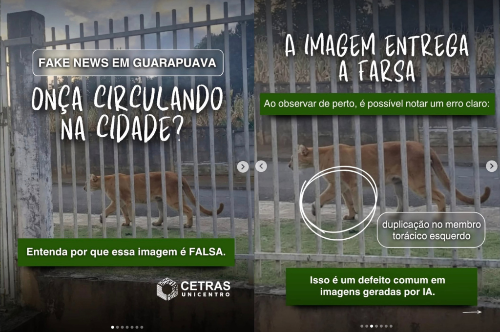 Lá, os agentes foram informados pelo precursor da boataria que tudo não passava de uma brincadeira despretensiosa e de mau gosto. Claro, ora! Bastava aos responsáveis por compartilhar a mentira olhar com cuidado para a imagem para notar que a suposta onça caminhava em cinco patas, conforme bem destacou o Centro de Triagem e Reabilitação de Animais Silvestres da Unicentro neste carrossel: