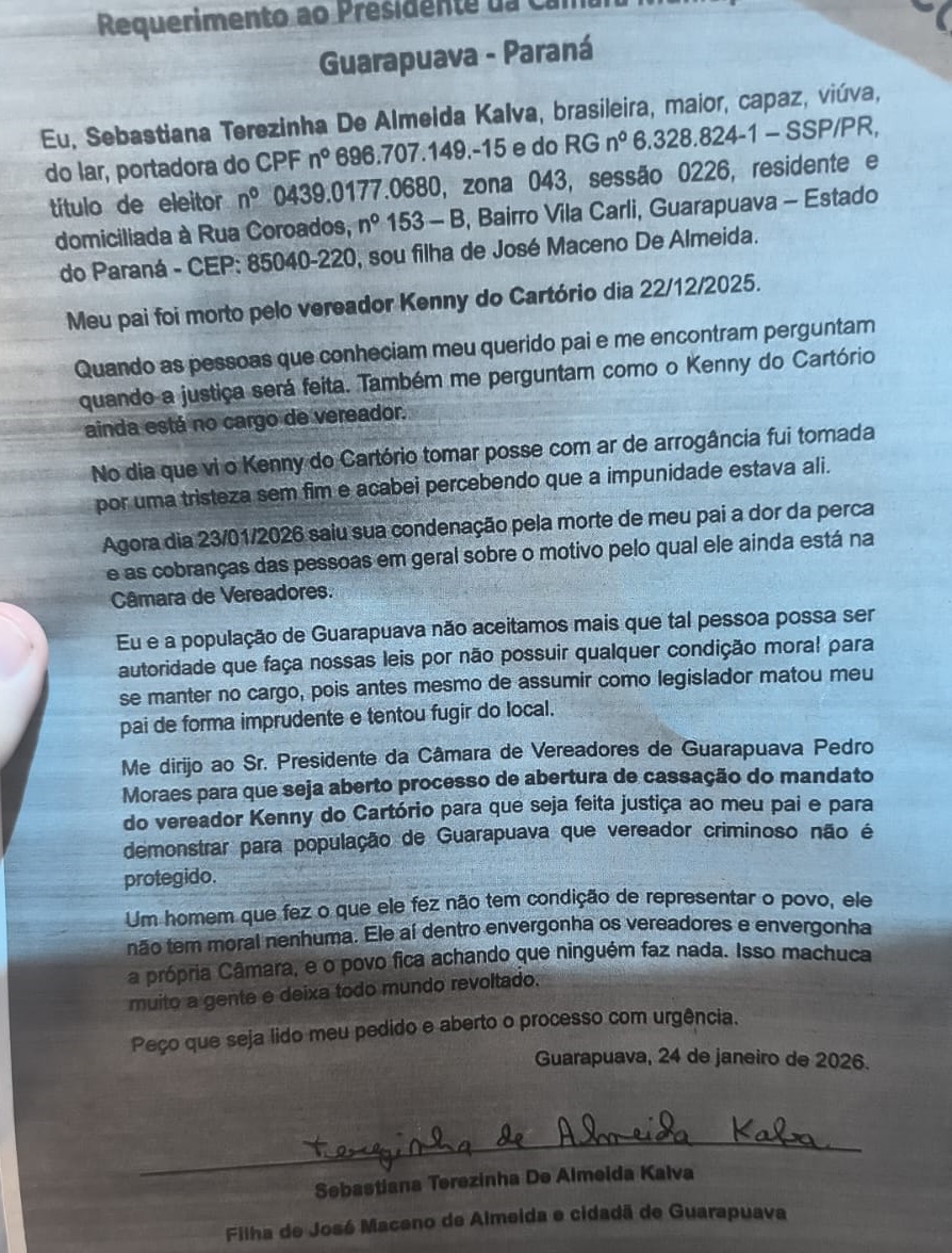 De acordo com Sebastiana, a família, que inclui netos e irmãos da vítima, entendem que ‘Kenny do Cartório’ como é conhecido o vereador Kenny Rogers, não pode continuar com mandato. “Esse homem não pode continuar representando a população. Já é a segunda condenação dele. É uma vergonha para a Câmara de Guarapuava e pedimos que os vereadores, que o presidente [Pedro Moraes] tenham uma iniciativa digna”.