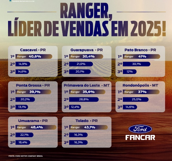 Confira abaixo o comparativo Ford Ranger x demais picapes em 2025, nas cidades que a Fancar está presente liderando o mercado: