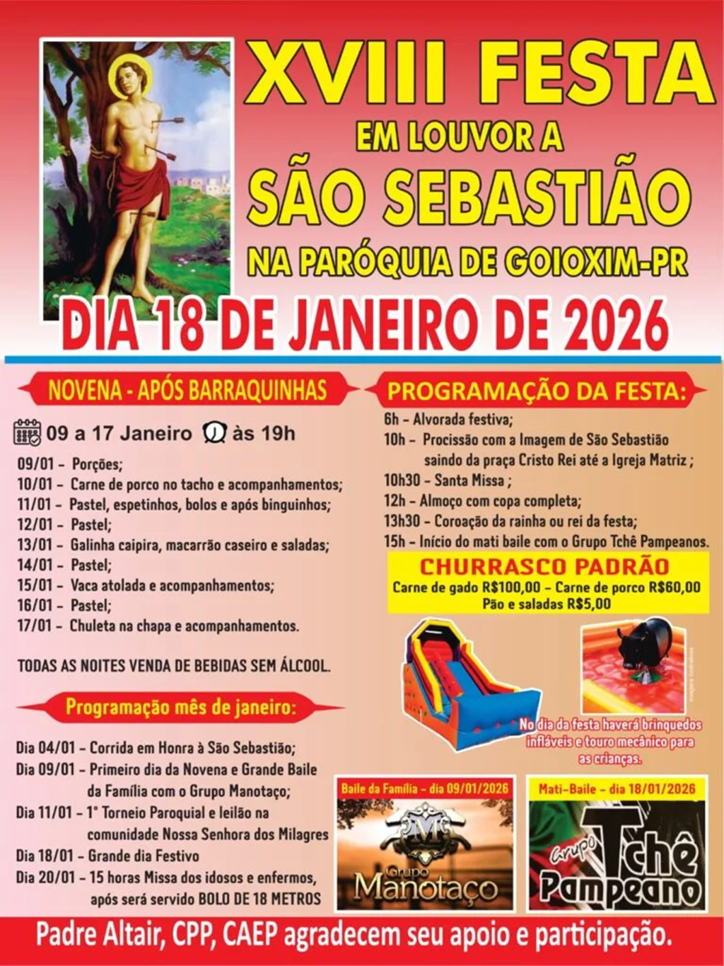 A Paróquia São Sebastião, em Goioxim, divulgou a programação oficial da XVIII Festa em Louvor ao santo. As atividades religiosas começam nesta sexta (9) com a tradicional novena, que segue até o dia 17 de janeiro, sempre às 19h.