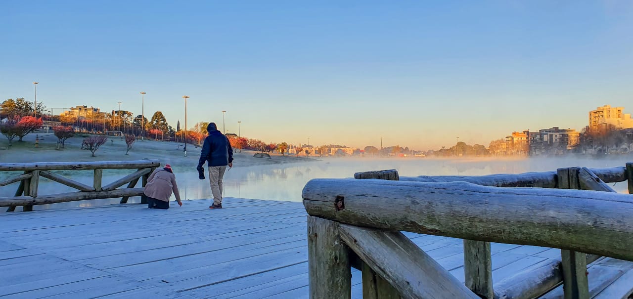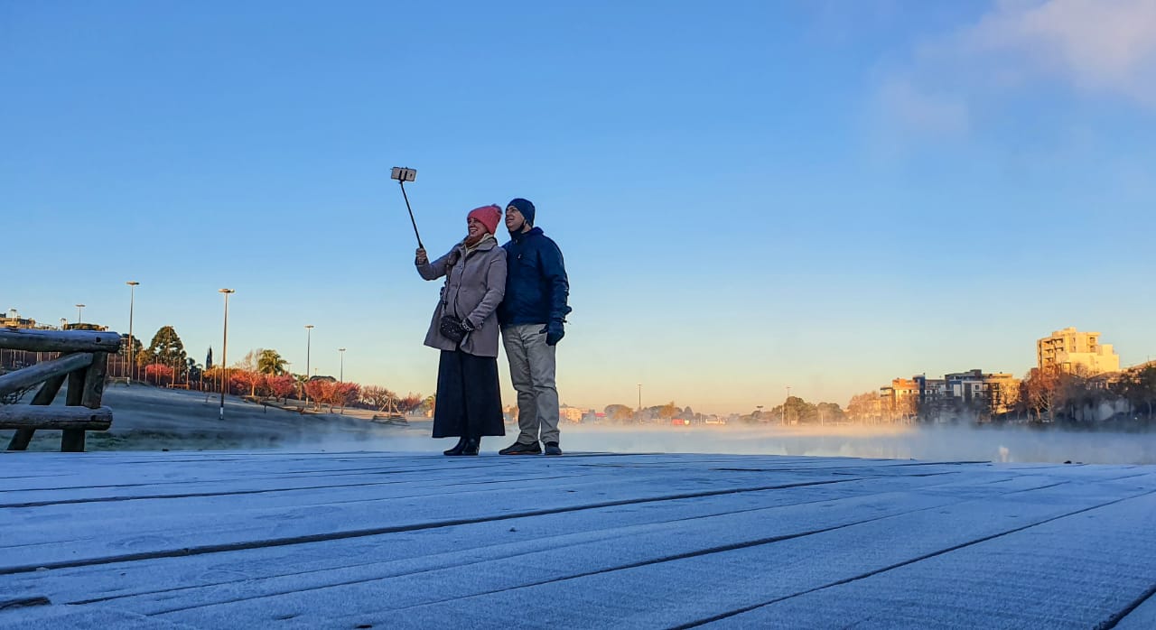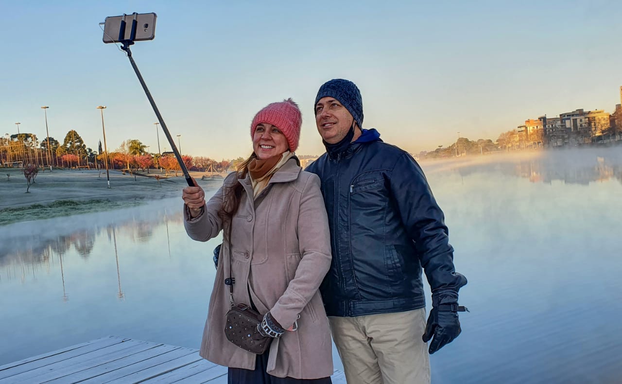 Apesar de Guarapuava ter registrado a menor temperatura do Paraná, segundo o Simepar, com -3,5ºC, as pessoas não se intimidaram. Muitas escolheram o Parque do Lago para registro fotográfico.