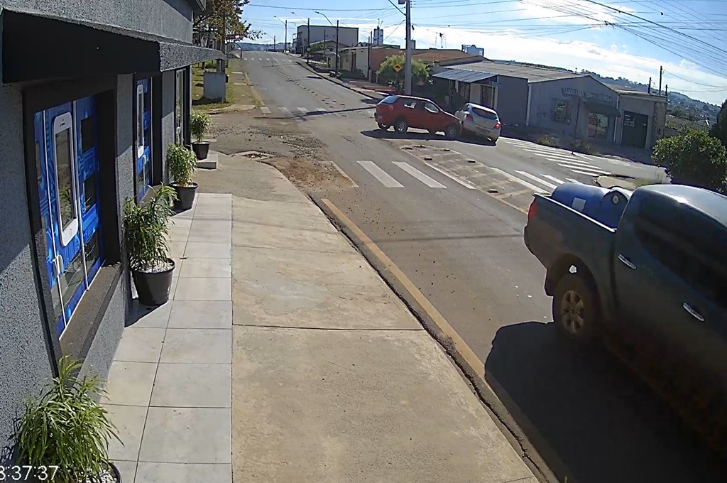 Um idoso, que estava na calçada em frente a um estabelecimento comercial, foi atingido por um carro e morreu na manhã deste sábado, no bairro Xarquinho, em Guarapuava. Conforme as imagens de uma câmera de monitoramento, o acidente ocorreu após o condutor de um Fiat/Palio vermelho desrespeitar a sinalização de preferencial. O veículo colidiu contra um Chevrolet/Onix que trafegava pela via.