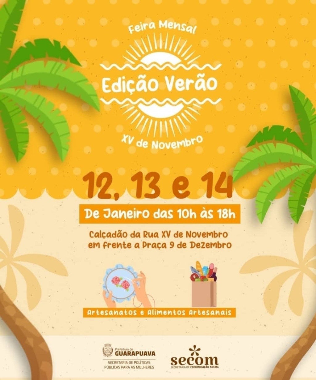 Os artesãos e produtores de alimentos artesanais de Guarapuava interessados em participar da ‘Feira Mensal da XV – Edição Especial de Verão’ precisam correr para se inscrever. Isso porque a Secretaria de Políticas Públicas para Mulheres (SPPM), abriu as inscrições para os interessados em expor na feira.