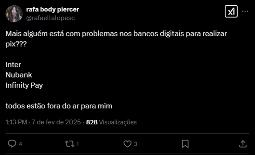 Nas redes sociais, diversos clientes relataram a falha, apontando dificuldades para transferências e recebimentos via Pix. Até o momento, nenhuma instituição financeira se pronunciou oficialmente sobre o problema.