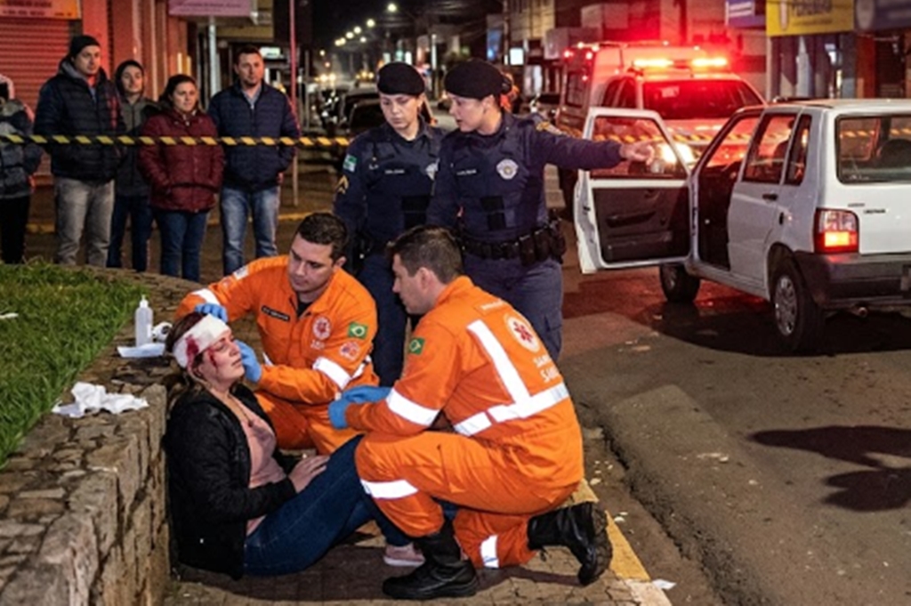 A Polícia Militar (PM) fazia patrulhamento de rotina quando se deparou com uma aglomeração de pessoas e uma mulher caída ao solo, com um corte na cabeça. No momento da chegada da viatura, um Fiat Uno Branco saiu em fuga em alta velocidade.