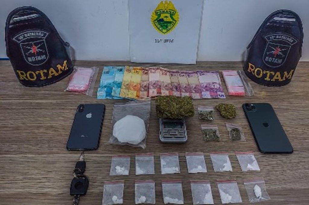 Um homem de 19 anos foi preso e uma adolescente de 17 anos, grávida, foi apreendida por envolvimento com o tráfico de drogas na noite de quinta (23), em Pitanga. A ação foi conduzida pela equipe da Rotam (Rondas Ostensivas Tático Móvel).