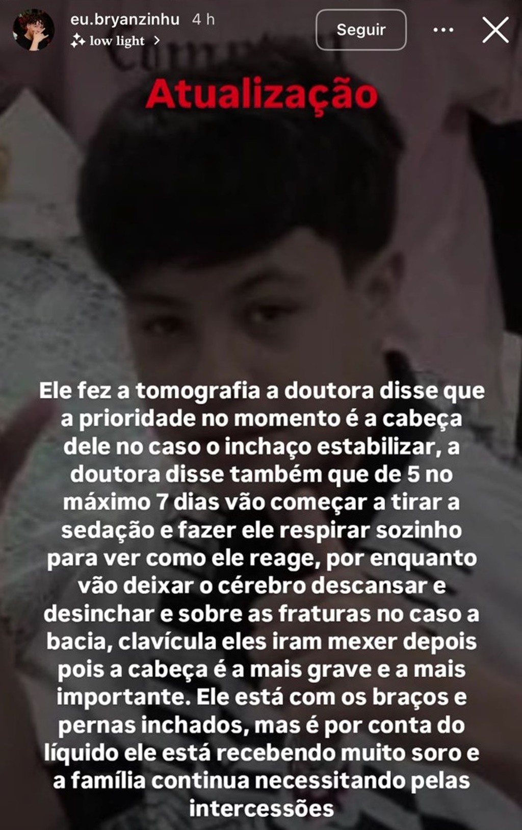 A família reforça o pedido de orações e apoio, enquanto aguarda a evolução do quadro clínico do menino.