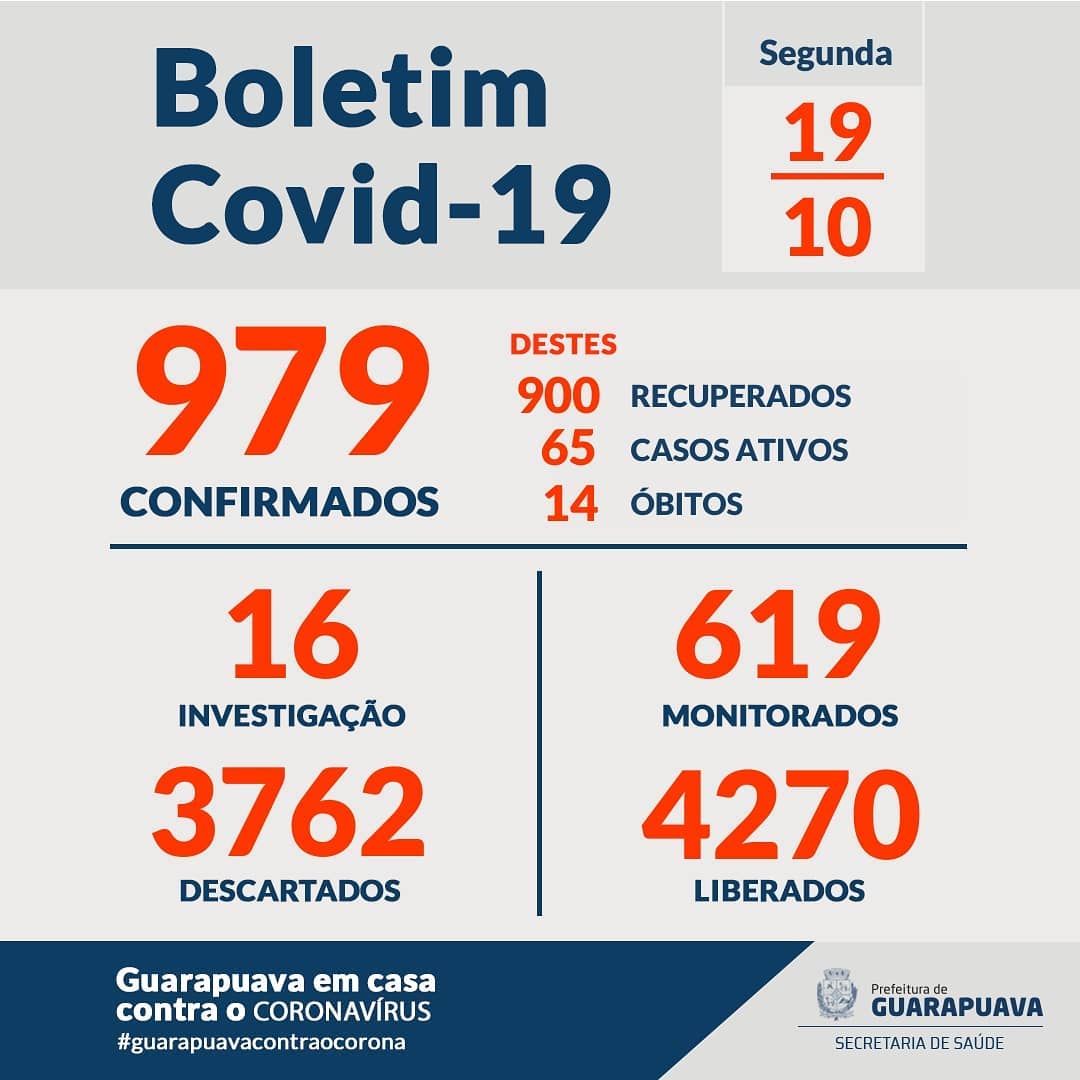 Também nesta segunda (19), o município de Guarapuava confirmou 18 novos casos de covid-19. Assim, o município soma, desde a primeira confirmação, 979 casos positivos. Os dados são da Secretaria Municipal de Saúde.