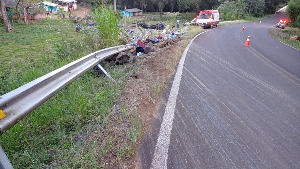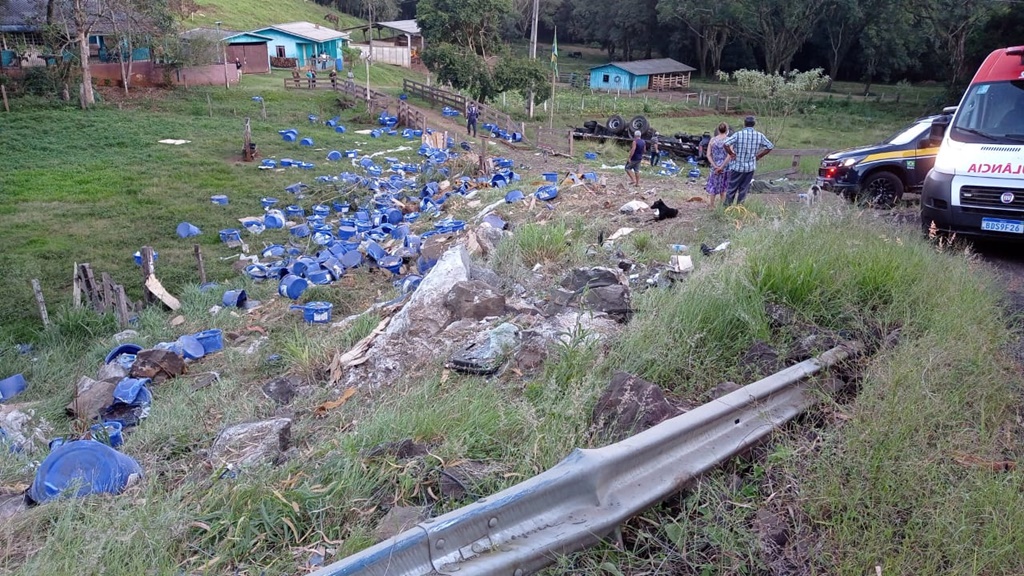A PRF informou que o caminhão Truck Azul graneleiro transportava recipientes com suplemento mineral para bovinos. E tombou na rodovia antes de capotar. A carga ficou espalhada ao lado da rodovia. O acidente aconteceu no sentido Palmital – Marquinho.