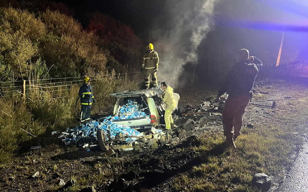 Motorista foge da PRF e picape carregada com cigarros pega fogo