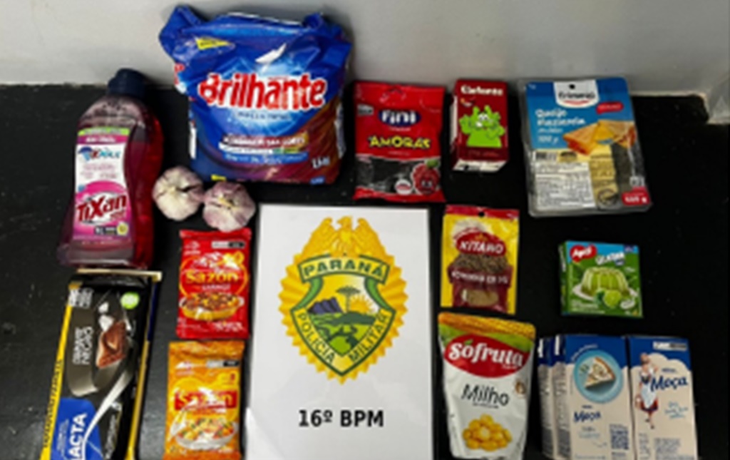 Com a suspeita, conforme a PM, estavam diversos itens. Entre eles duas barras de chocolate, quatro caixas de leite condensado, meio quilo de queijo mussarela. Além de um pacote de sabão em pó e um frasco de sabão líquido, além de outros produtos alimentícios e temperos.