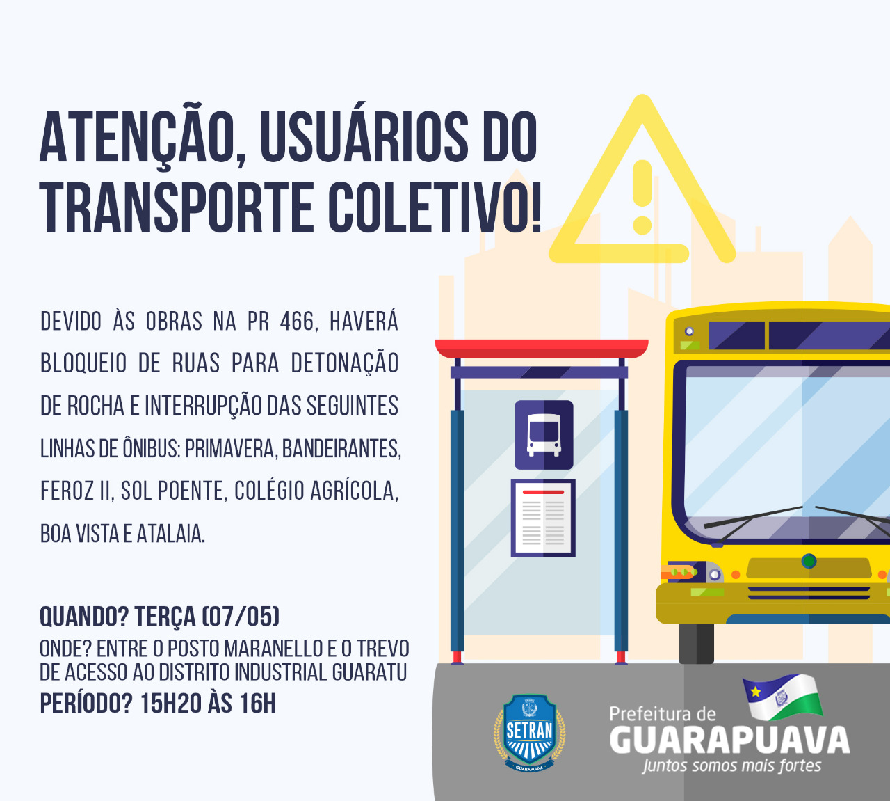 Detonação de rochas na tarde desta terça feira (7) vai interromper o tráfego de veículos, e algumas linhas de ônibus, na PR-466, em Guarapuava. A interrupção será nas proximidades do Posto Maranello e o trevo de acesso ao Distrito Industrial Guaratu.