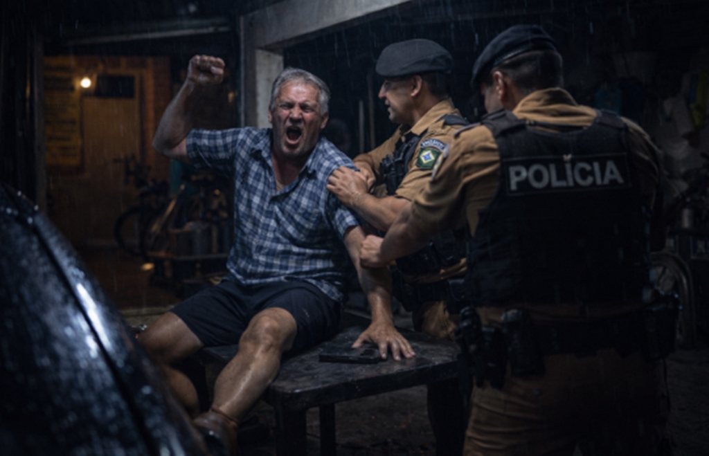 Os policiais localizaram o homem na garagem. Ao perceber a presença policial, passou a desacatar os militares, gritando frases ofensivas e questionando a legalidade da ação. Mesmo após receber voz de abordagem, ele se recusou a obedecer, sentando-se sobre uma mesa e alegando ser deficiente físico para evitar a revista.