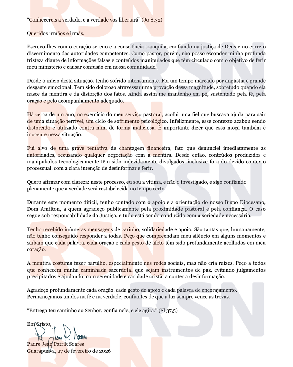 Jean Patrik nega mensagens íntimas, se diz vítima e fala em manipulação de conteúdos. Portal RSN obteve pronunciamento do sacerdote com exclusividade