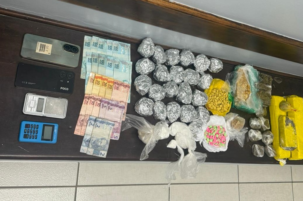 As equipes então se deslocaram até a residência do jovem. A esposa dele autorizou a entrada e acompanhou as buscas. No quarto do casal, dentro de uma gaveta e em uma caixa de mercado, os policiais encontraram um verdadeiro estoque de drogas, além de balança de precisão e máquina de cartão.