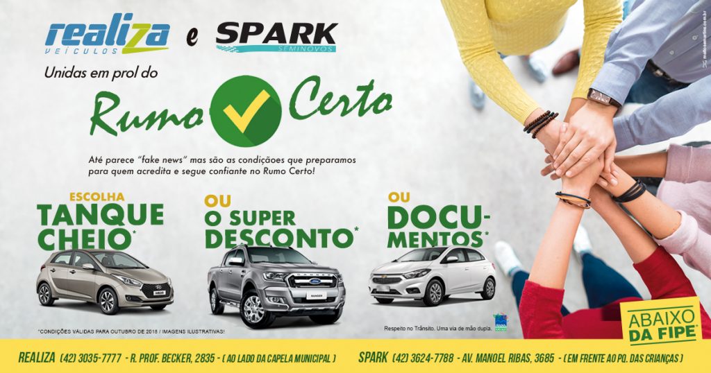 As lojas de seminovos Realiza e Spark, de Guarapuava, uniram forças por um objetivo maior: oferecer condições verdadeiras, sem falsas promessas, garantindo a qualidade e boa procedência dos veículos para seus clientes. A união foi firmada com o lançamento da campanha ‘Rumo Certo’.
