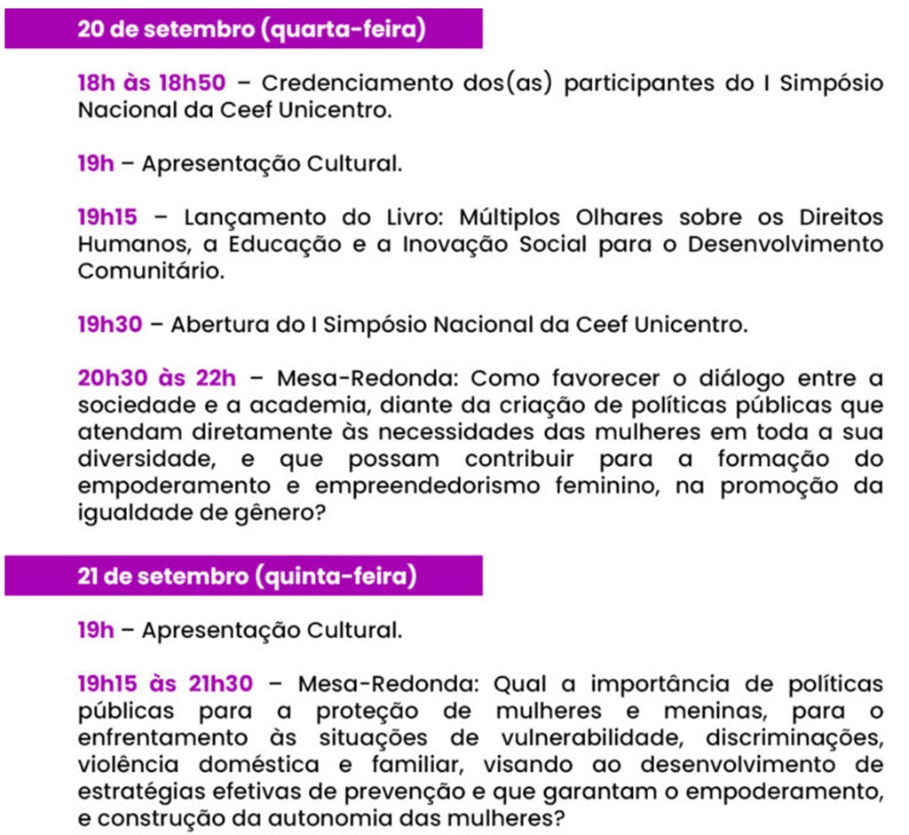 E com isso, desenvolver estratégias efetivas de prevenção que garantam o empoderamento e a construção da autonomia das mulheres. Haverá apresentações culturais e o lançamento do livro “Múltiplos Olhares sobre os Direitos Humanos, a Educação e a Inovação Social para o Desenvolvimento Comunitário”.