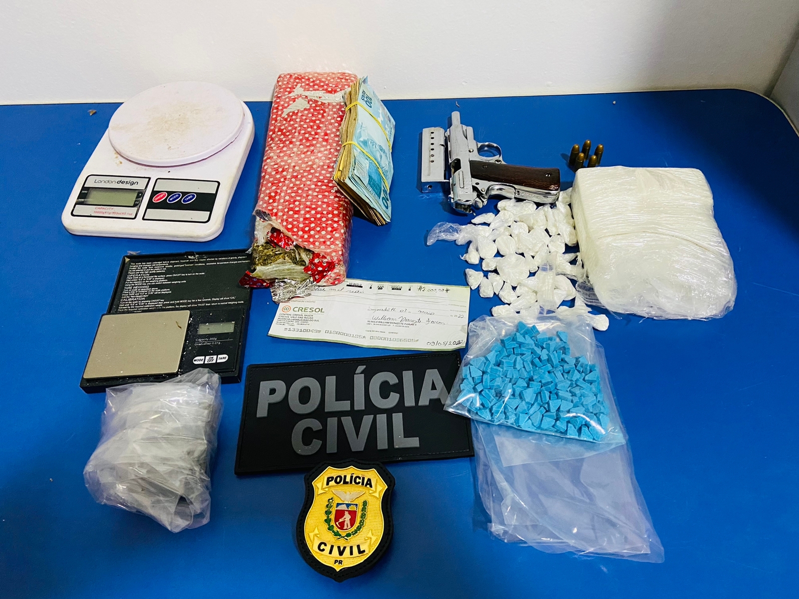Conforme a polícia, durante a ação foram apreendidos cerca de R$ 5 mil em espécie, um cheque no valor de R$ 2 mil, o carro, uma pistola calibre 32. Além disso, ele estava com quase meio quilo de cocaína, aproximadamente um quilo de maconha e 283 comprimidos de ecstasy, além de uma balança de precisão.