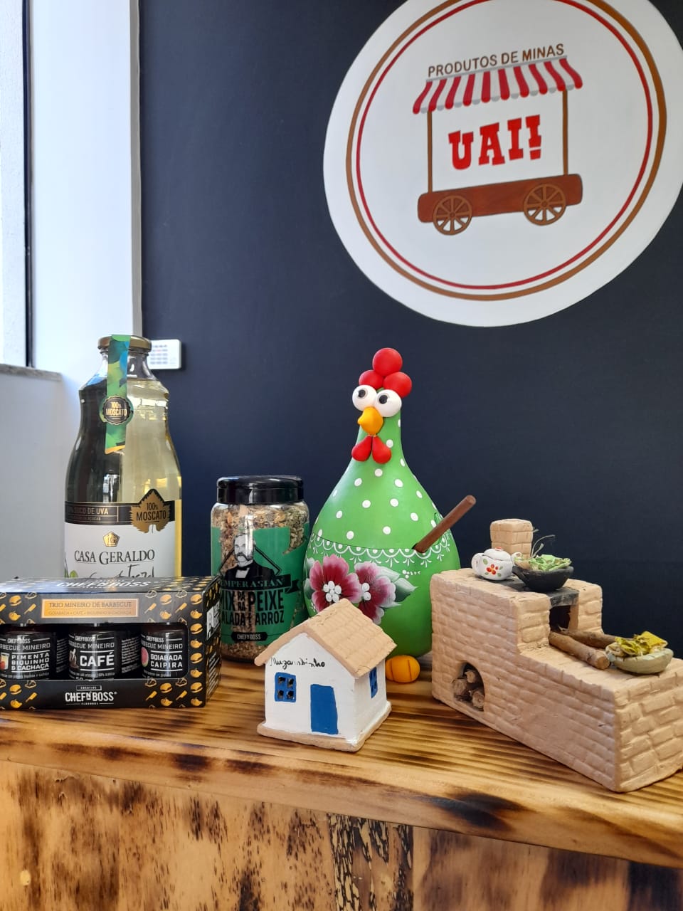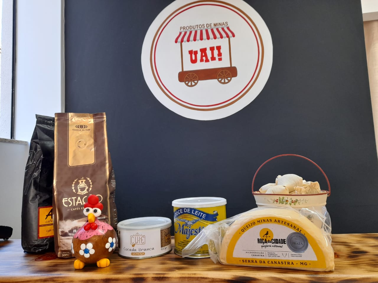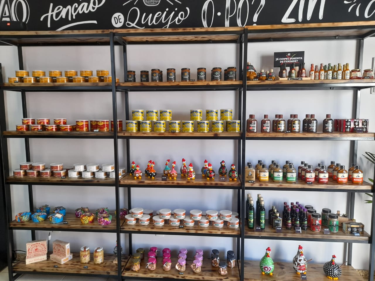 Café do Sul de Minas, doce de leite, sucos, pimentas, queijos e artesanatos chamam a atenção de quem entra na loja. Se a ideia era se conectar com as raízes, como o casal explica, o plano foi bem sucedido, já que oferece também um pão de queijo congelado artesanal feito especialmente pelo mineiro. Assim, levando o sabor de minas para sua casa.