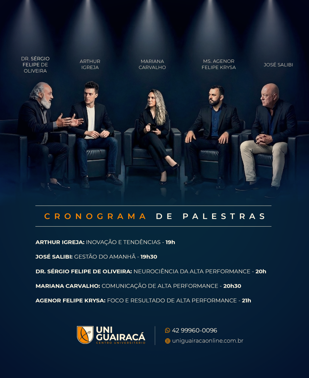 Entre os palestrantes confirmados estão Arthur Igreja, José Salibi, Sérgio Felipe de Oliveira e Mariana Carvalho. Os temas abordam desde inovação e tendências até gestão, comunicação e desempenho de alta performance. A proposta é traduzir conceitos técnicos em práticas aplicáveis ao cotidiano profissional e empresarial.