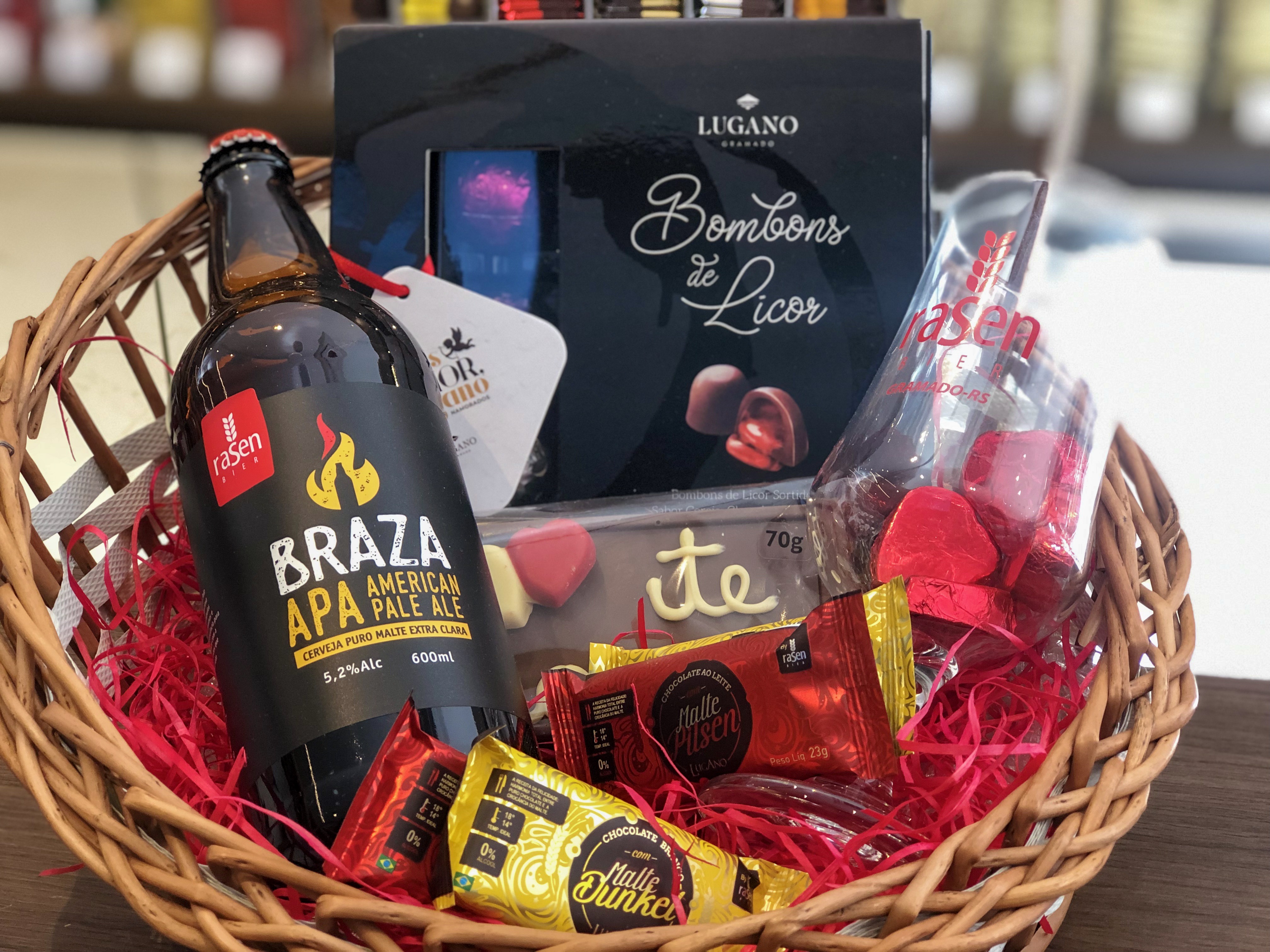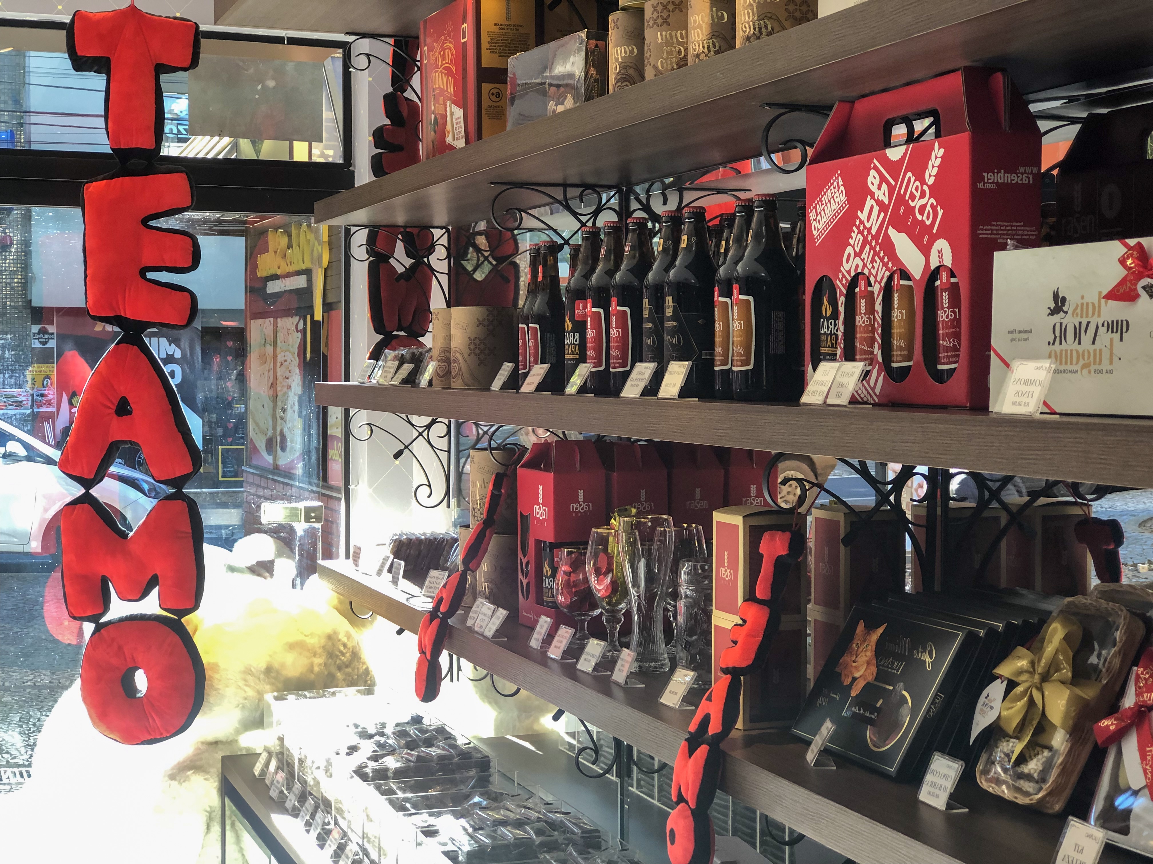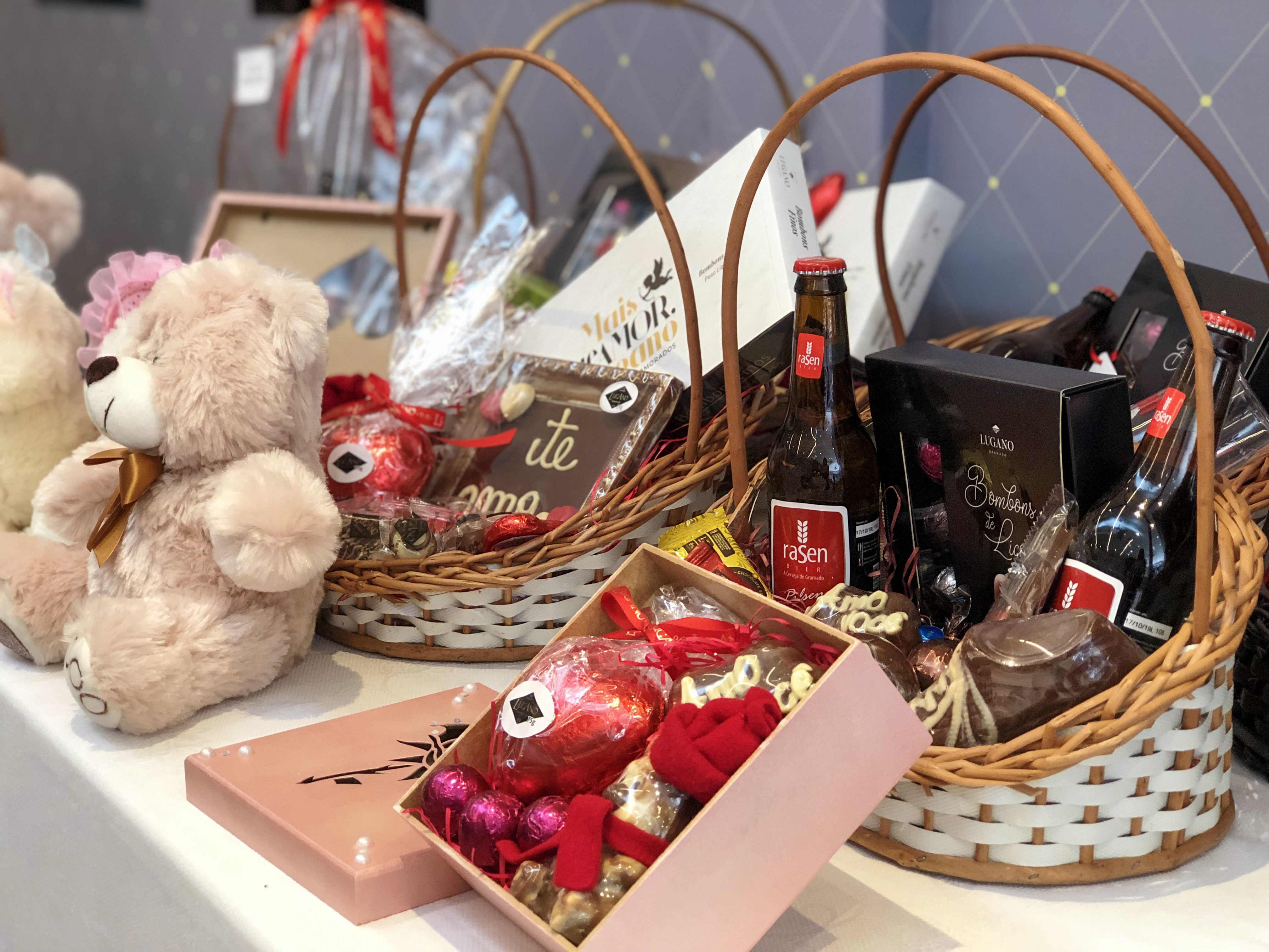 Para o Dia dos Namorados, o carro-chefe da loja são as cestas personalizadas. Há propostas já montadas, mas você também pode escolher os itens para compor. Uma infinidade de chocolates podem ser combinados com cursinhos de pelúcia, cervejas artesanais, vinhos ou espumantes. Destaque especial para a cerveja de chocolate, que é novidade!