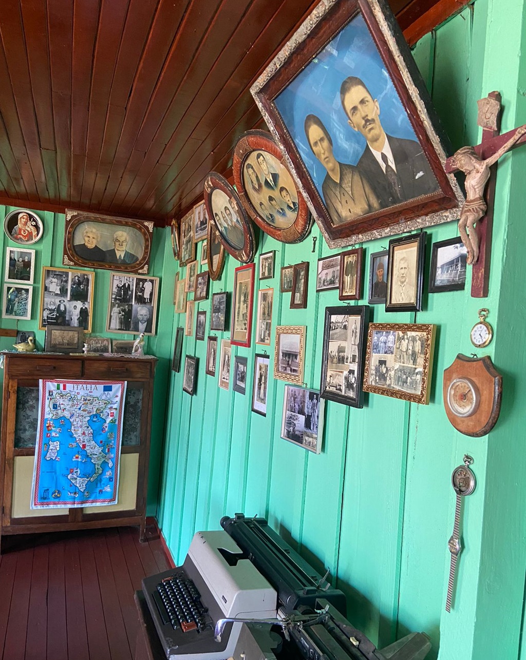 Há também um jogo de bocha bem antigo, tem mesa antiga, relógio de parede antigo que era bem tradicional nas casas dos italianos, tem muitos quadro de santo muita coisa que tem lá veio da Itália, como quadros e um crucifixo e imagens religiosas.