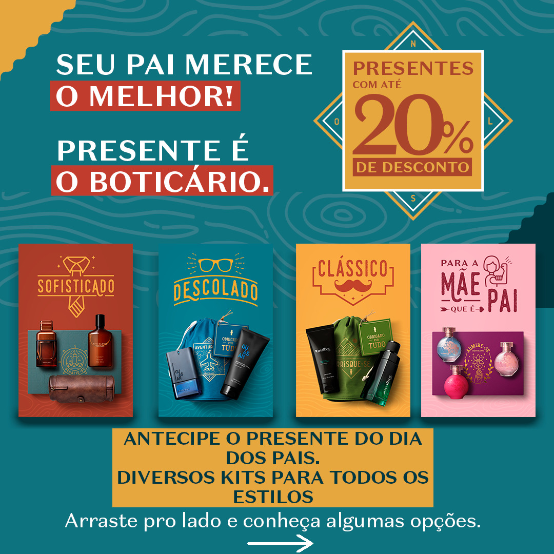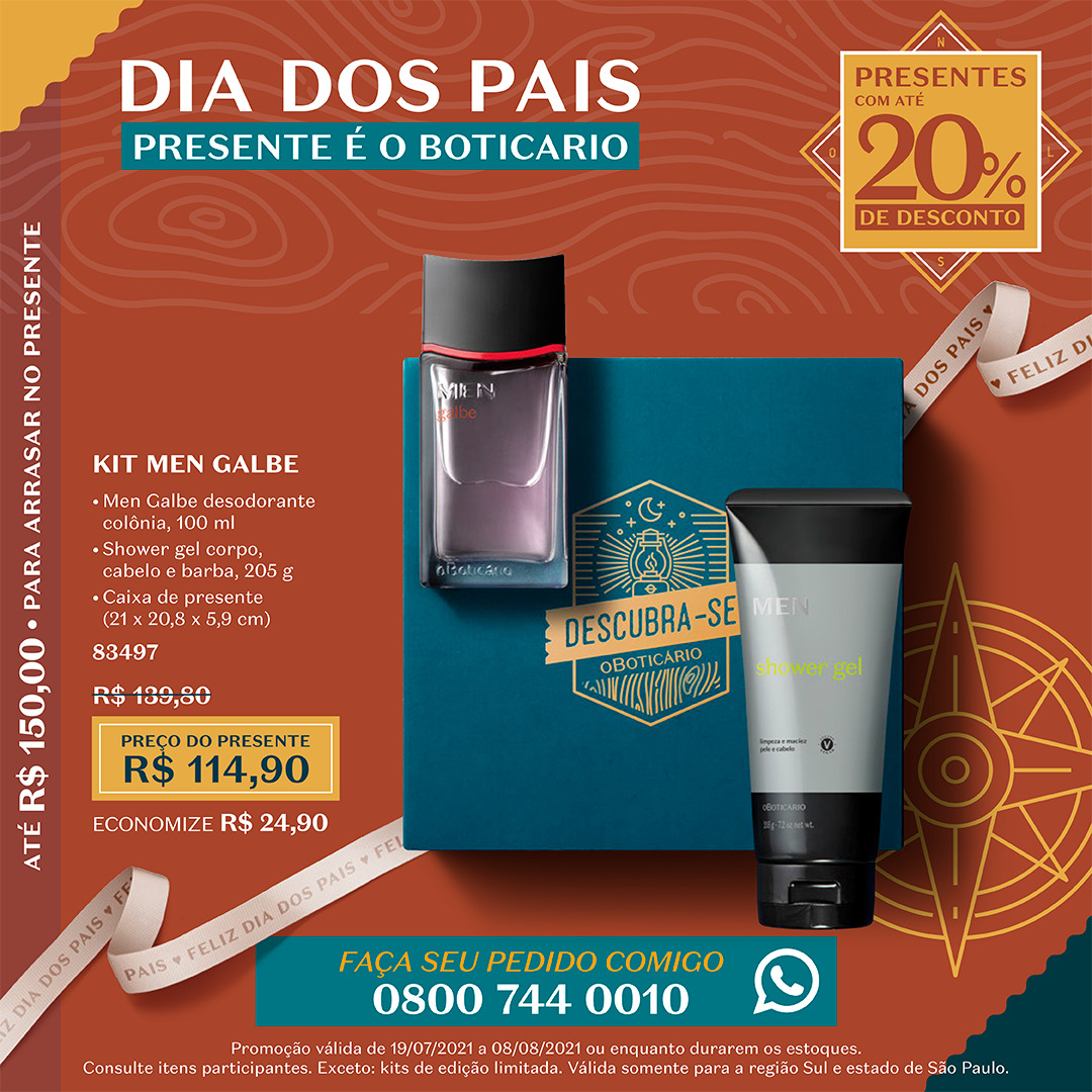 Além desses, apresentamos o Men Galbe, que conta com um perfume masculino refrescante, com notas cítricas e verdes, perfeita para homens que não têm medo de se reinventar. O kit vem com o shower gel do Boticário pode ser aplicado tanto na pele, quanto no cabelo e na barba.