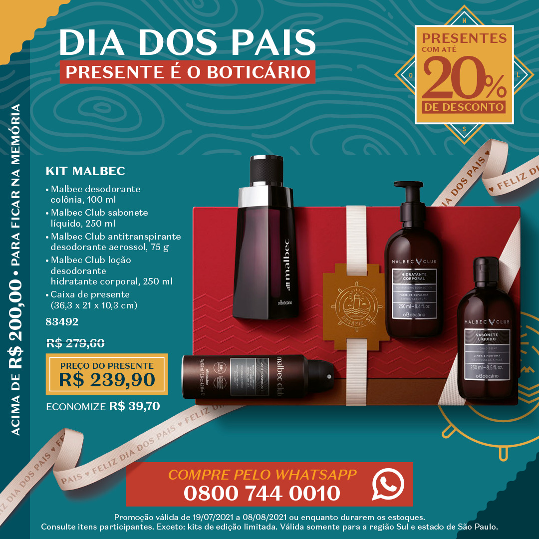 Outro clássico das fragrâncias masculinas é o Malbec. O combo conta com desodorante colônia, loção desodorante, sabonete líquido e loção desodorante. Dá até para imaginar como quem você ama vai sair cheiroso. Já dá pra ir pensando em receber a vacina cheiroso, com um dos melhores produtos do Boticário.