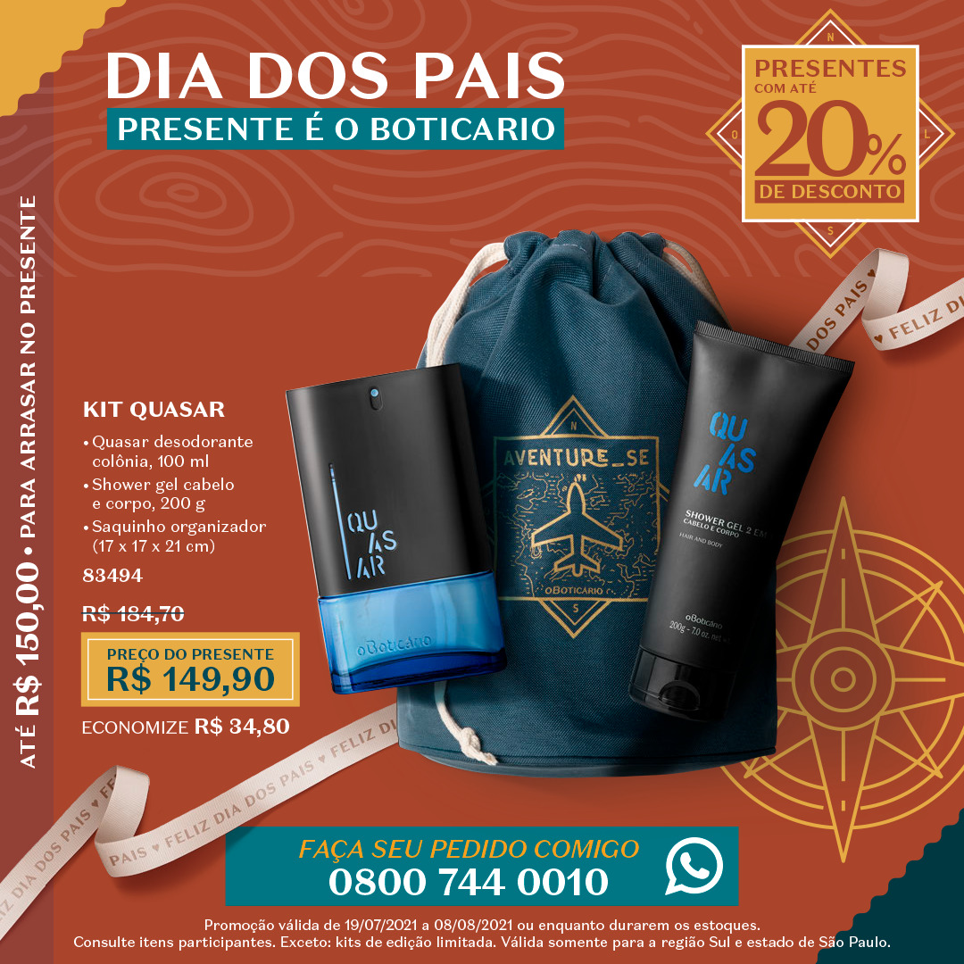 Já é quase tradição presentear com perfumes e sabemos que não tem como o papai não gostar. Então, que tal presenteá-lo com um kit especial d’O Boticário? Entre as opções mais tradicionais está o Quasar, carro chefe da perfumaria quando se fala em perfume masculino. O kit conta com o shower gel, que é uma solução especial para cuidar do corpo e do cabelo, com uma espuma cremosa e perfumada que limpa a pele e deixa o cabelo mais brilhoso e macio.