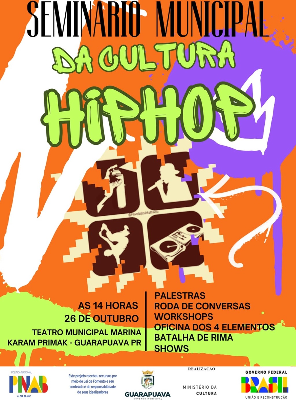 Guarapuava celebra a força da cultura de rua neste domingo (26). O Seminário Municipal da Cultura Hip-hop encerra as atividades com o aguardado espetáculo ‘Das Ruas ao Palco’. O show, às 17h30, no Teatro Marina Karam Primak, em Guarapuava, leva ao Centro da cidade a arte, a rima e a dança desenvolvidas por mais de 40 jovens e crianças nas oficinas dos quatro elementos. No entanto, as atividades começam às 14h, com palestra, seguida por roda de conversa, workshops, além de oficinas sobre os quatro elementos. ‘Sal da Rima’ faz um ‘pocket’ com palestra e também show. Tudo de graça.