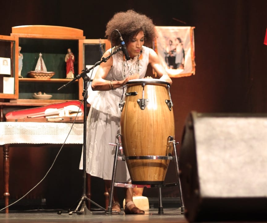 A percussionista Djankaw Kilombola enriquece o ambiente com a arte e presença dela.