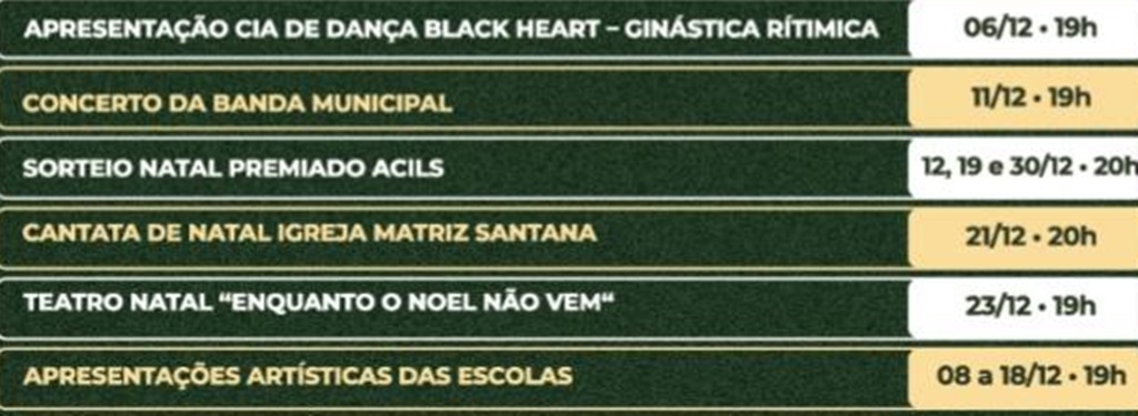 Não foi só a sede da prefeitura que ganhou iluminação: a praça central, o lago municipal, as principais avenidas e o portal da cidade também receberam decoração. A programação artística batizada de ‘Natal de Luz’ espalha eventos gratuitos por todo o mês de dezembro. São cantatas com 140 crianças nas janelas da Prefeitura, abrindo a programação no dia 30 de novembro. Danças, teatro, sorteios, trenzinho são algumas atrações que movimentam a cidade tão logo a noite cai.  Numa das ruas, a Praça de Alimentação oferece opções gastronômicas para quaquer gosto. Ou seja: a cidade deixou de ser apenas cenário: virou personagem.