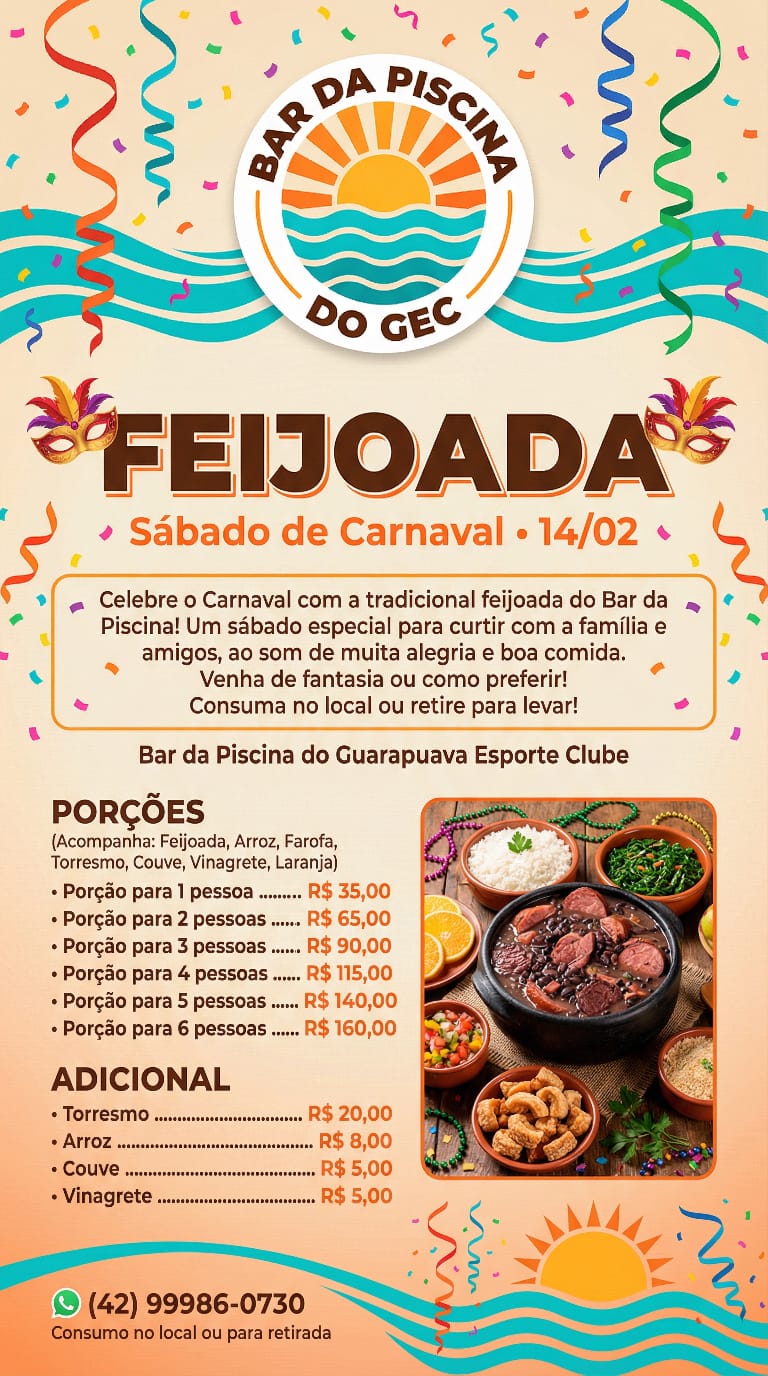 Carnaval também é mesa cheia, e o Bar da Piscina do GEC entra na história com a Feijoada de Sábado (14) de Carnaval. Conforme a diretoria, o GEC reforça o espírito de festa sem exigir fantasia obrigatória: “venha de fantasia ou como preferir”. E a opção é de consumir a feijoada no local ou retirar para levar. Contato/WhatsApp do Bar da Piscina: (42) 9 9986-0730.
