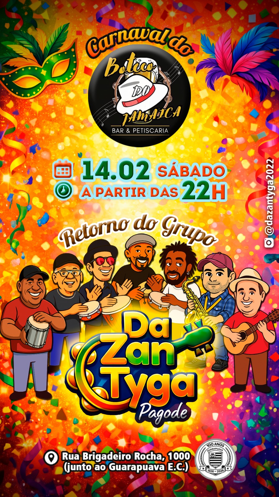 Para quem prefere o Carnaval no compasso do samba e do pagode, o sábado (14), a partir das 22h, tem atração anunciada como “Retorno do grupo Da Zan Tyga (Pagode)”, no Carnaval do Boteco do Jamaica – Bar & Petiscaria.