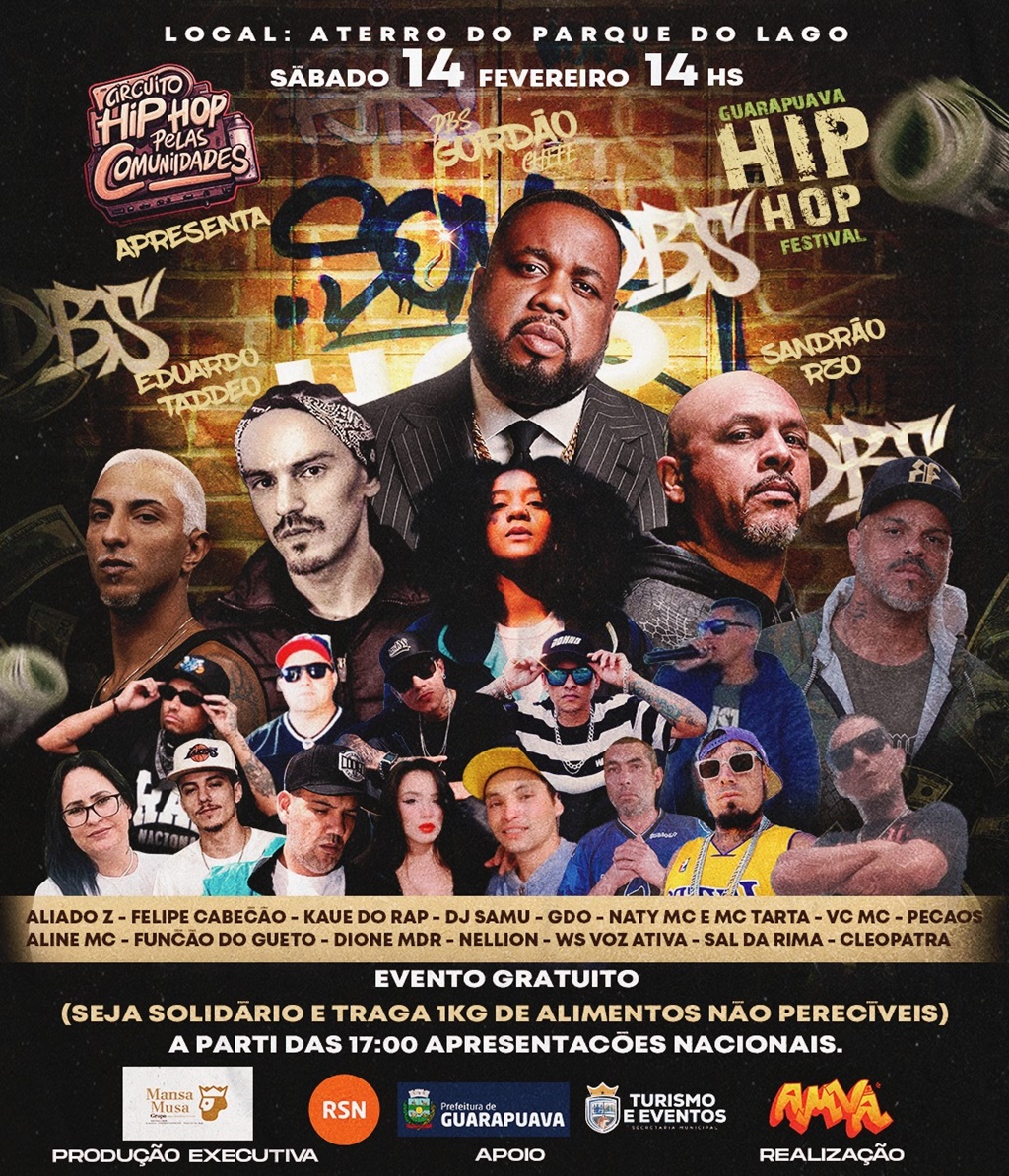 O cartaz já dá o tom: não é apenas “show”. De acordo com WS Voz Ativa, é celebração de cena, com nomes nacionais e uma lista robusta de artistas que carregam a base local/regional no peito. Isso  porque hip-hop de verdade é isso: microfone aberto para quem tem história pra contar.